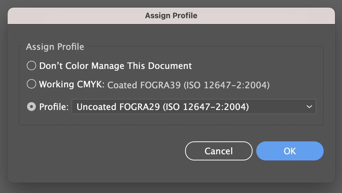 2. Ставим ICC Profile: Uncoated FOGRA29 ( Edit - Assing Profile, в ячейки Profile указанно какой профиль у вас сейчас стоит, выбираем нужный нам профиль ) (