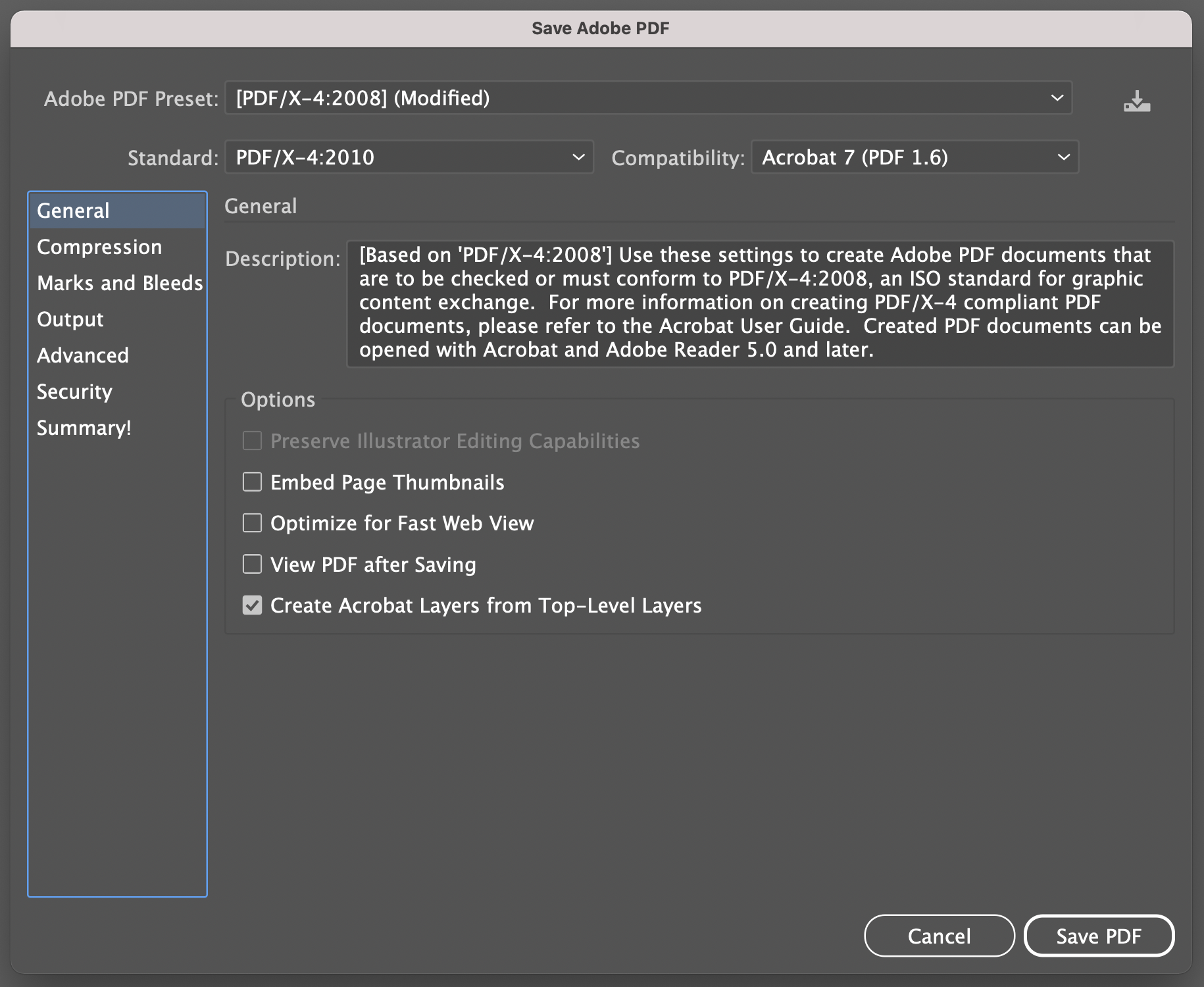 Сохраняем PDf во вкладке General нажимаем галочку Create Acrobat Layers from Top-Level Layers