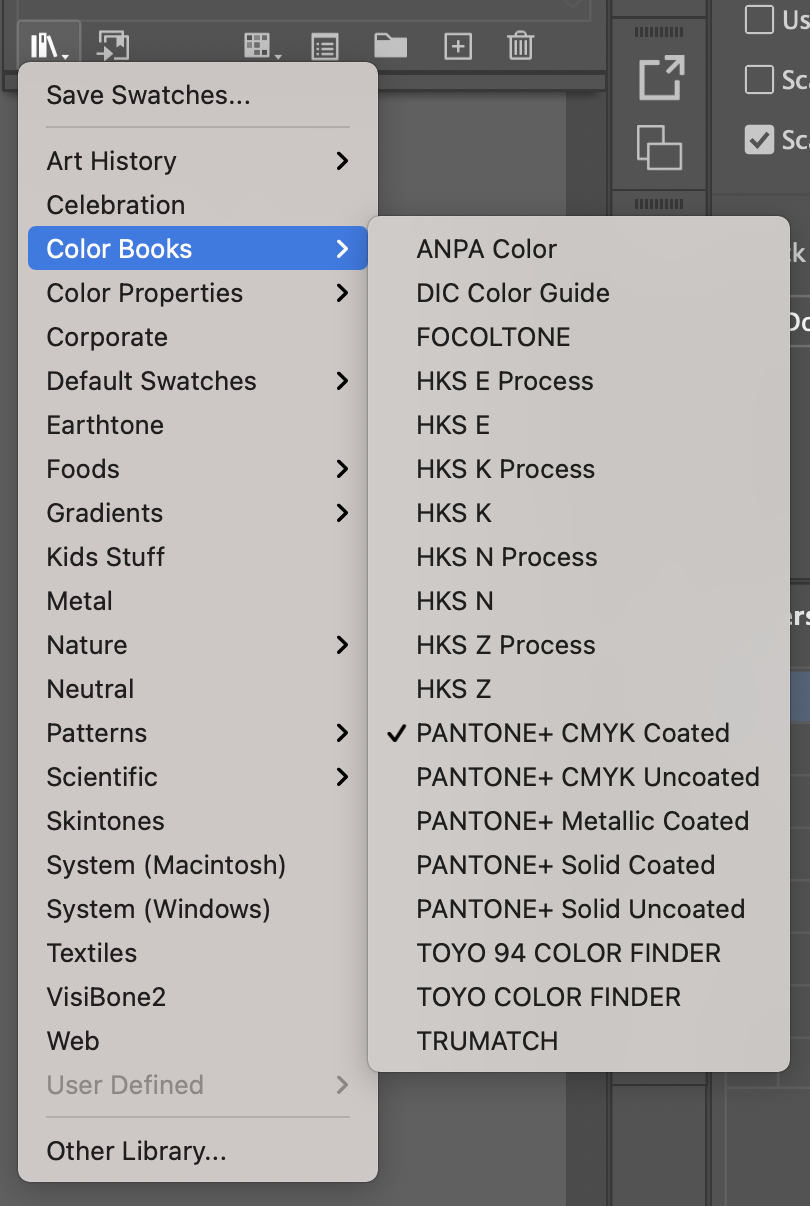 - В палитре Swatches в иконке — книжечки, лежащие друг на друге, выбираем каталог цветов — Color books.