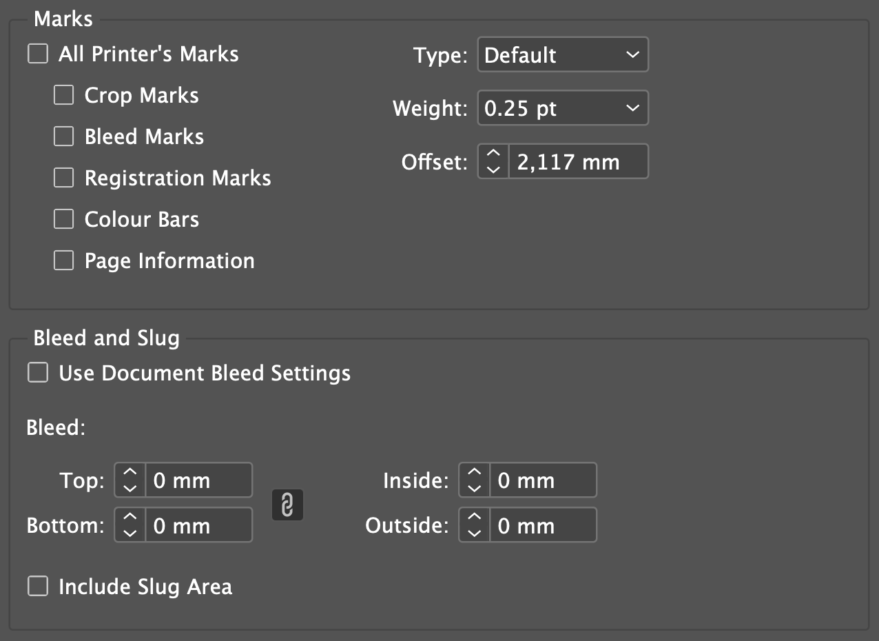 Crop Marks - метки реза Bleed Marks - добавляет блиды визуально Registration Marks - какие то круглешки Colour Bars - цветовые шкалы Page Information - краткая информация ( название и т.д. )